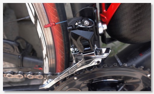 次にトップの解除位置で、インジケータの線を見ながら、FDのアジャスターボルトで張りを調整。